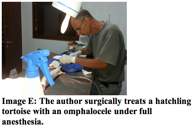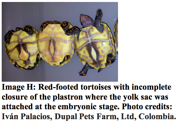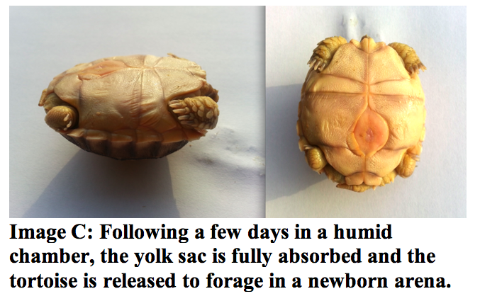 In the past couple of years, several African spurred tortoise (Centrochelys sulcata) were brought to our facility with the yolk sac still attached to the plastron. A remnant yolk sac could be fully, or partially absorbed, at the time when the tortoise hatches from the egg. In both conditions, it is best not to interfere surgically, but to place the tortoises in a humid cage with heating, and mimic the “inside-egg conditions” for a few days, until the yolk sac is fully absorbed. The following images present such conditions.