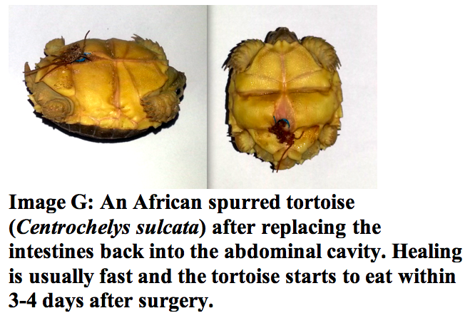 Following the surgery, the newborn healing tortoise may fast 4-8 days. It is placed on a clean paper towel and hygiene is maintained carefully. To encourage eating after surgery it is best to add to its cage a few other tortoise offspring that has no appetite deficits. Healing is fast after the tortoise regains eating.